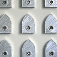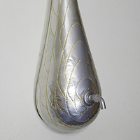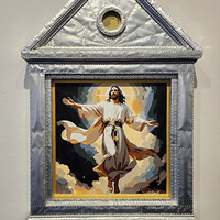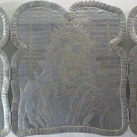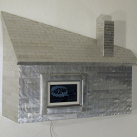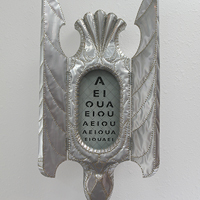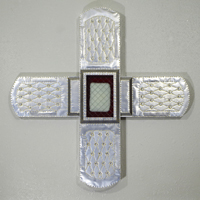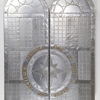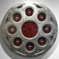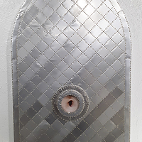 ; 2018; wood, brass nails, aluminum beverage cans, safety glass, velvet, found object; 48"H x 48"W x 5"D