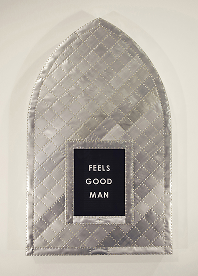 ; 2021; wood, aluminum beverage cans, brass plated nails, plexiglass, felt sign board, plastic letters; 29"H x 18.5"W x 3"D