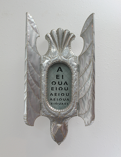 ; 2012; wood, brass nails, aluminum beverage cans, safety glass, laser cut steel, paint; 28"H x 7.5"W x 7"D (closed) 15"W (open)