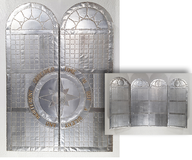 ; 2022; wood, aluminum beverage cans, brass plated nails, plastic signage letters; 28"H x 20"W (closed)/40"W (open) x 5"D
